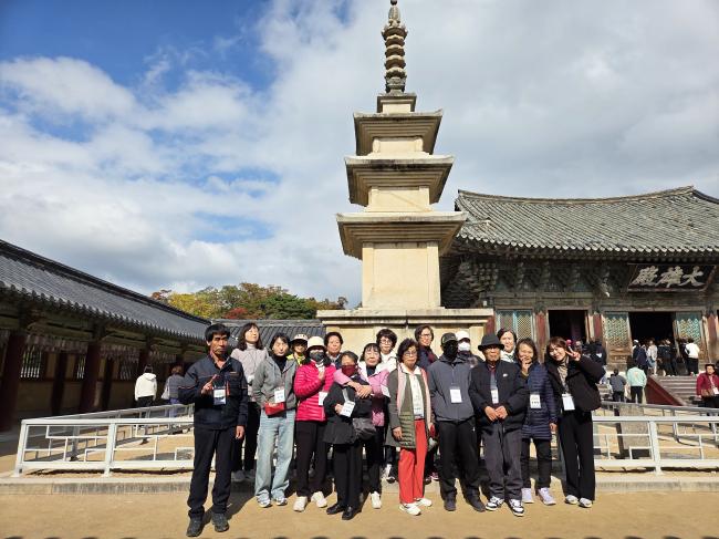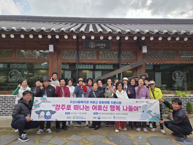 구산사회복지관 “경주로 떠나는 어르신 행복 나들이” 진행 ❍ 일시: 2025. 11. 3.(월) 09:00~18:00 ❍ 장소: 경주 문화 관광지(불국사, 첨성대, 교촌마들 등) ❍ 대상: 지역 내 어르신 20명 ❍ 내용: 불국사 관람, 이색 체험, 첨성대 투어, 인생사진 남기기 등 문화체육관광부와 한국관광협회중앙회의 지원으로 지역 내 취약계층 어르신 대상 ‘경주로 떠나는 어르신 행복 나들이’를 진행했습니다. 귀한 기회를 지원해주신 문화체육관광부와 한국관광협회중앙회(라이프맵)에 깊은 감사를 드리며, 앞으로도 어르신들이 웃음과 활력을 되찾을 수 있는 다양한 문화 프로그램을 이어가도록 노력하겠습니다.