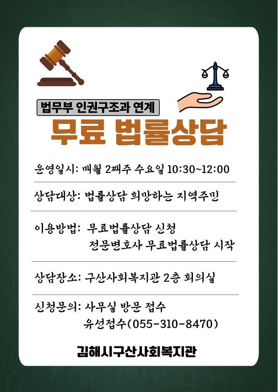 구산사회복지관에서는 매월 둘째주 수요일 사회적 취약계층을 대상으로 1:1 무료 법률상담을 진행합니다.