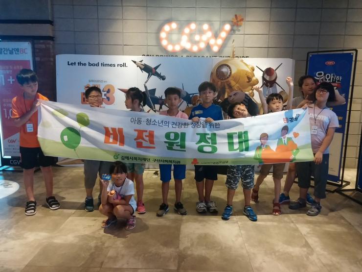 "비전원정대" 김해 CGV 영화 관람 구산사회복지관에서는 아동/청소년의 건강한 성장을 위한 "비전원정대"회원을 대상으로 김해 CGV에서 영화관람 문화나눔을 실시하였습니다. 비전원정대 회원 10명이 참여한 이 행사에서는 영화 "슈퍼 배드3"를 관람하며 영화관 먹거리도를 맛보는 시간을 가졌습니다. * 일시 : 2017년 7월 26일(수) * 장소 : 김해 CGV